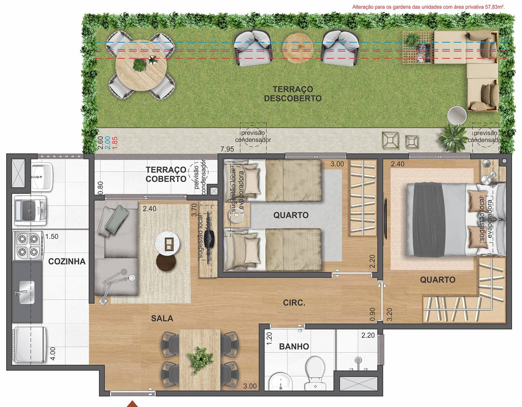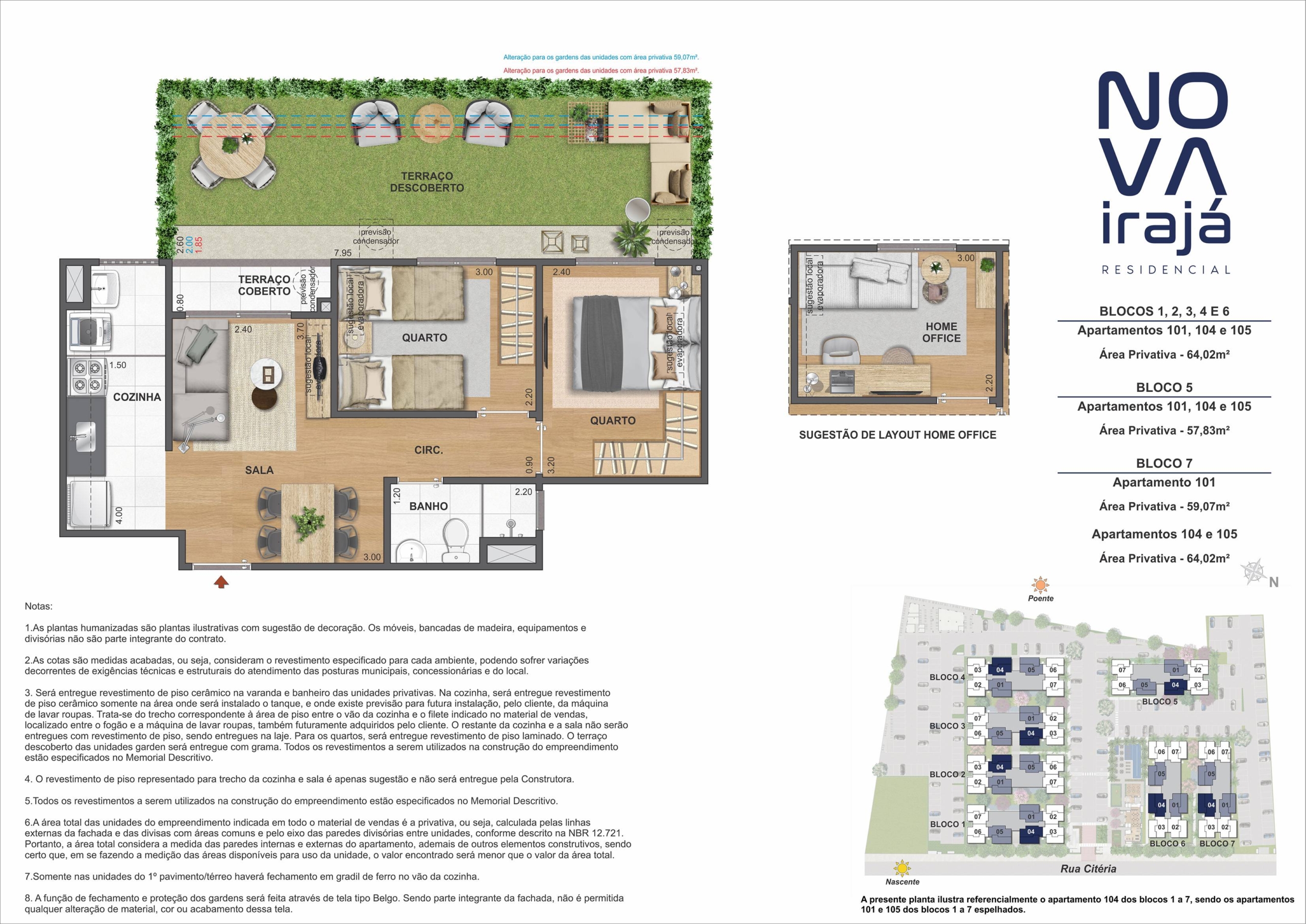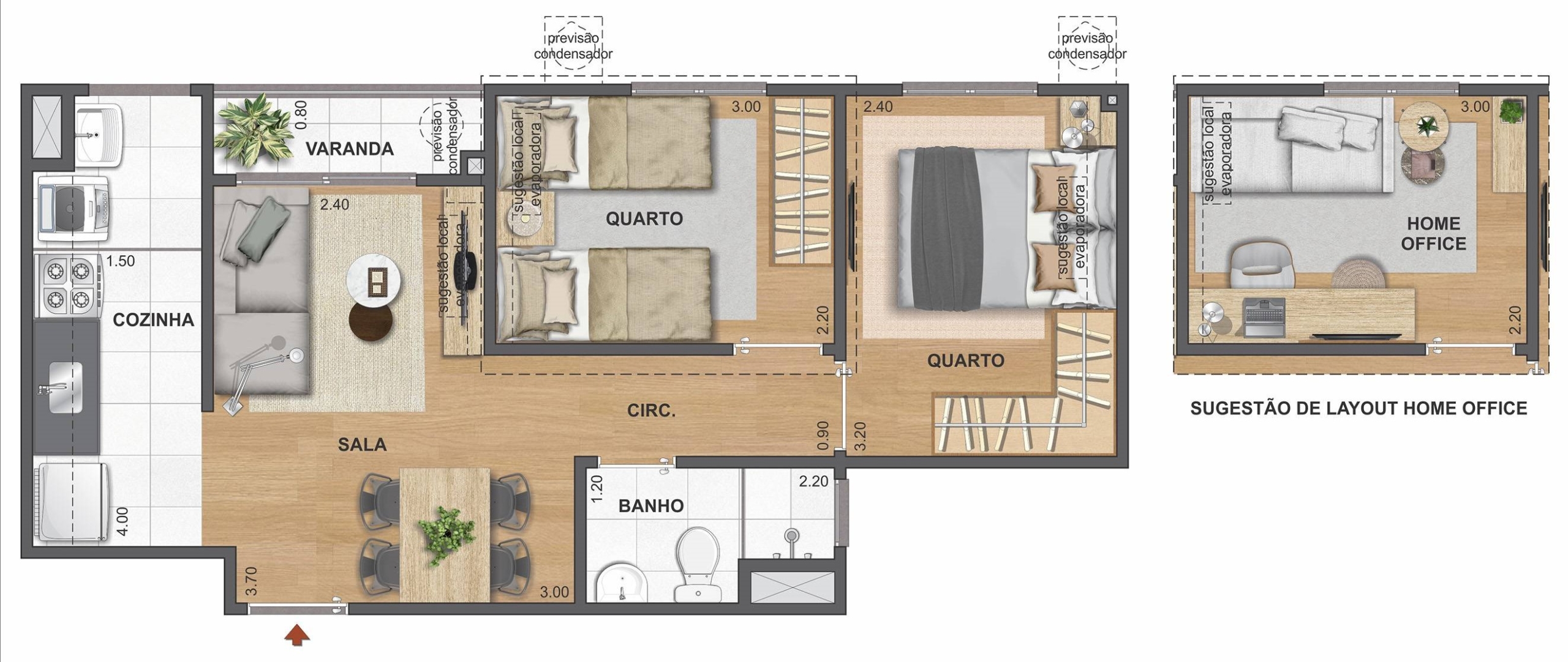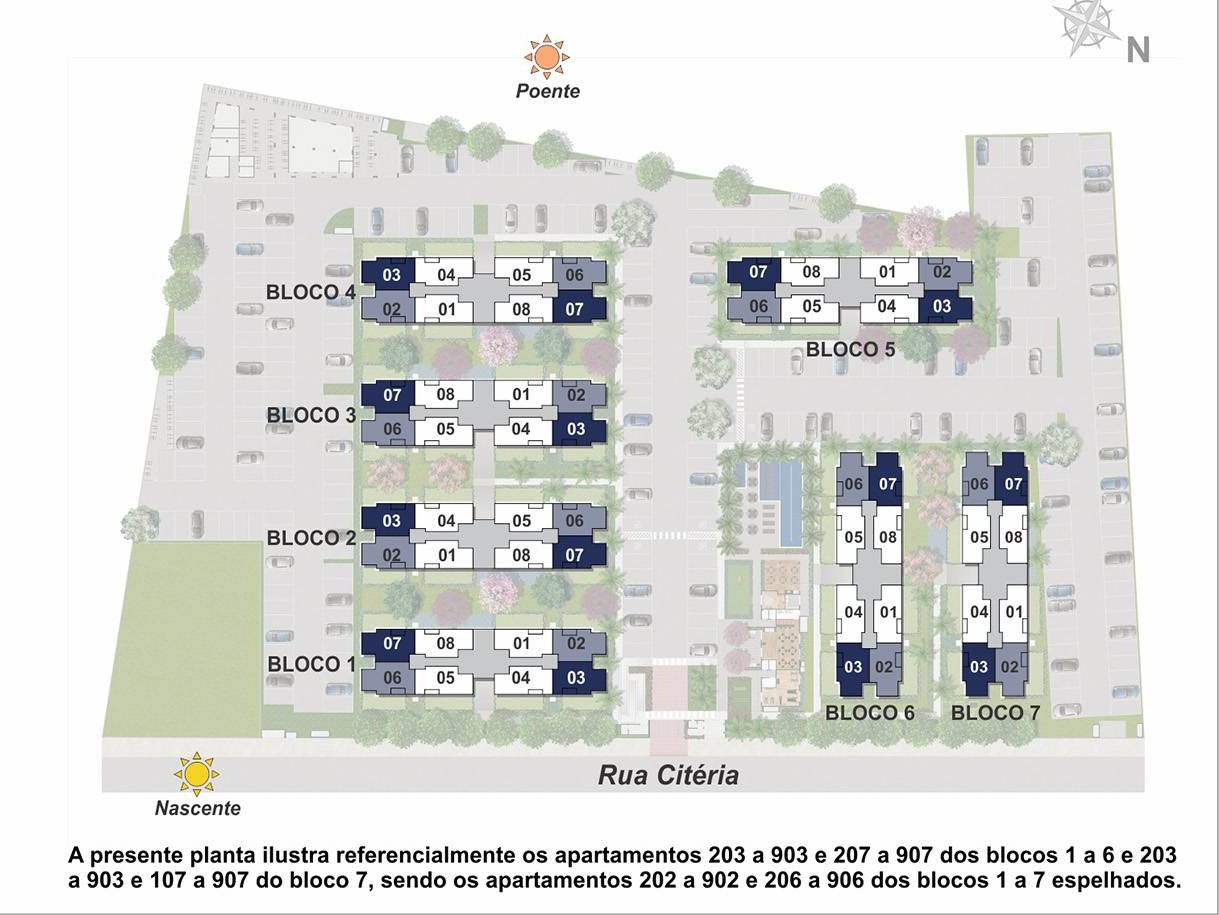 O Apartamentos: Plantas Tipos 2 Quartos e Plantas Gardens de 42 a 59 m² com opção de vaga de garagem.